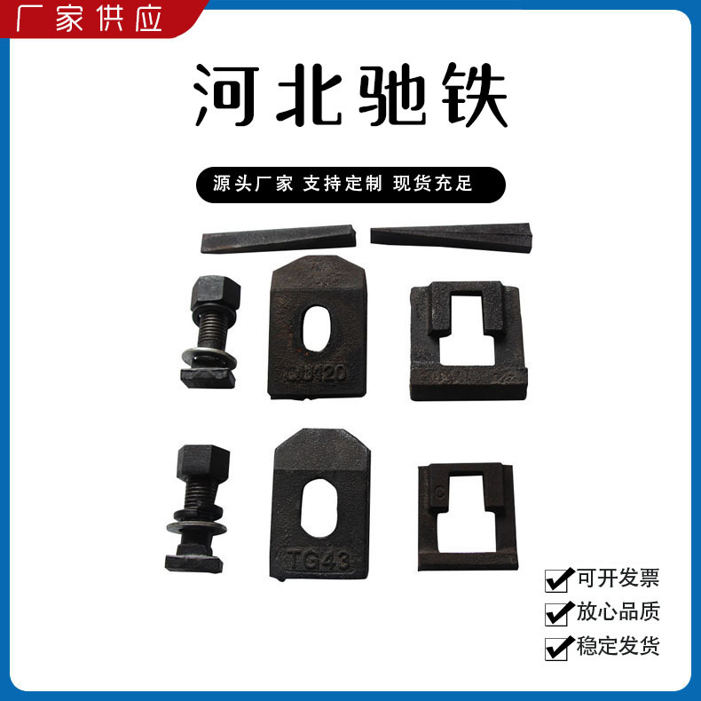 主要產(chǎn)品:鐵路配件、行車配件、工礦配件、魚尾板、道釘、壓軌器、軌道壓板、軌距拉桿、護(hù)軌扣板、T型螺栓、魚尾螺栓、彈條、軌距擋板